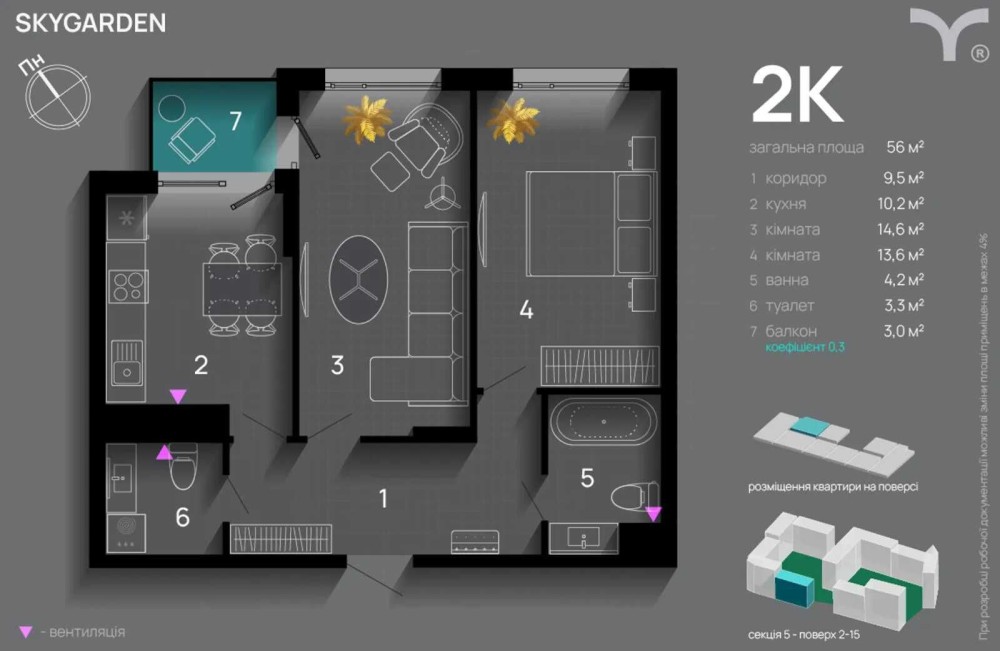 Квартира внутрішня, світла та має продумане функціональне планування загальною площею 56 м². Планування включає: прихожу, роздільний санвузол, кухню з виходом на балкон, спальню та простору вітальню — ідеальний варіант для комфортного проживання.