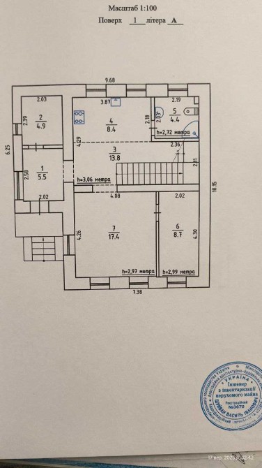 1 поверх: коридор, котельня, кухня, санвузол, вітальня, кабінет. На першому поверсі тепла водяна підлога.