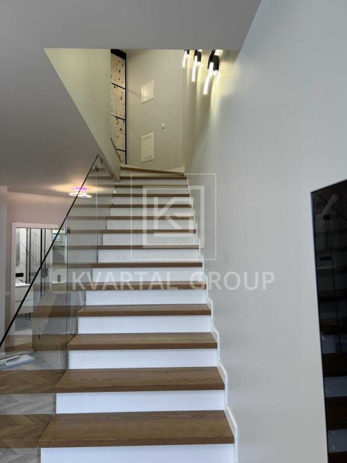 Перше, що вражає, — це простір. Велика світла вітальня з панорамними вікнами наповнює дім природним світлом і дарує відчуття свободи. Дерев’яна підлога, сучасне освітлення, продумана кухня у благородних холодних відтінках — кожен елемент створює відчуття затишку та високого рівня життя. Тут хочеться зустрічати ранок, працювати, запрошувати гостей і просто насолоджуватися атмосферою.