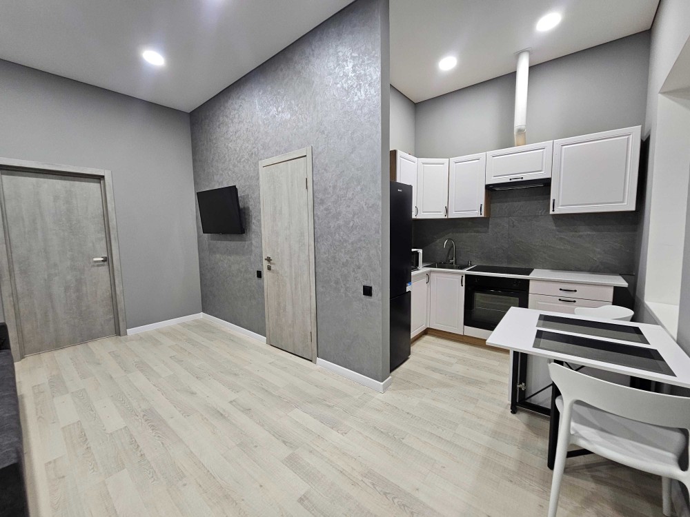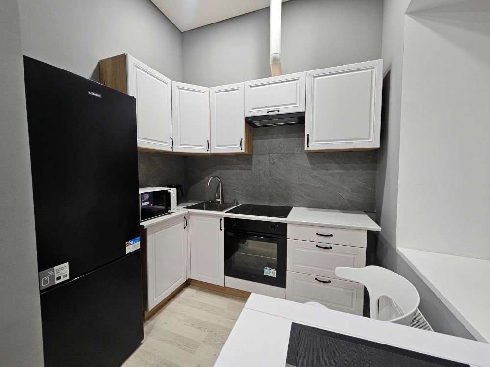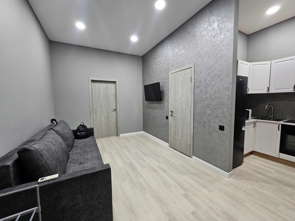 Гостиная объединена с кухней, где установлен кондиционер, холодильник и смарт-телевизор, раскладной диван, кухонная мебель, духовой шкаф, индукционная плита, чайник, микроволновка и двухкамерный холодильник.