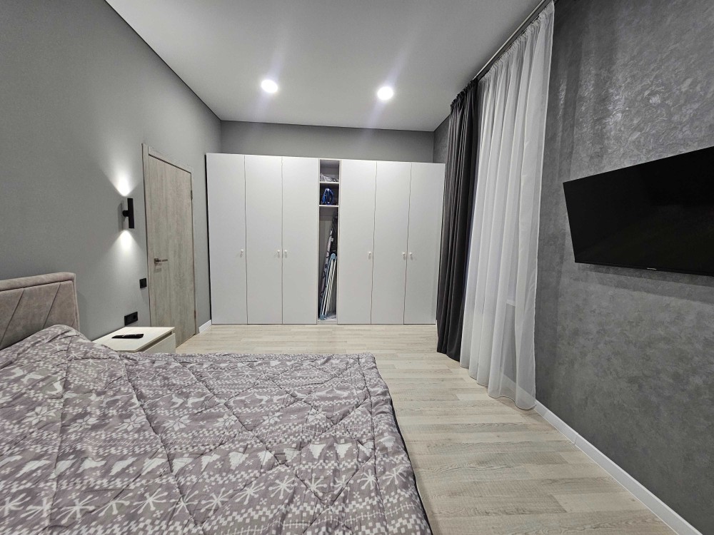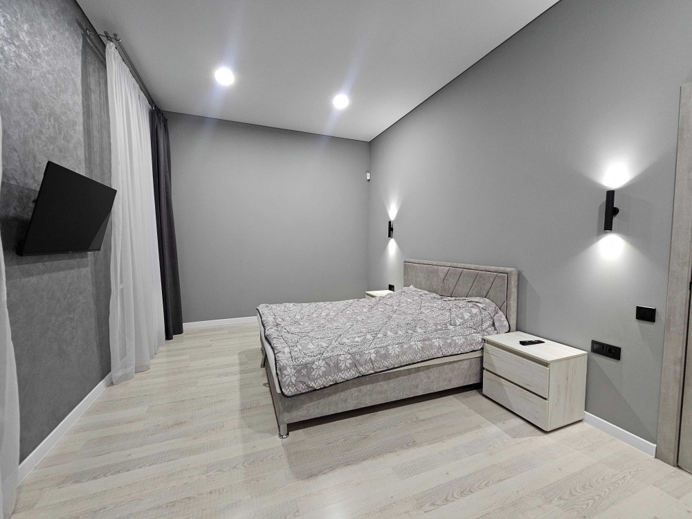 В спальне размещена двуспальная кровать, тумбочки и телевизор.