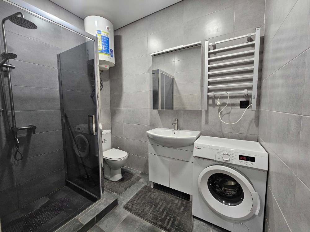 Санузел объединен, облицован плиткой, установлены стиральная машина, душевая кабина и бойлер.