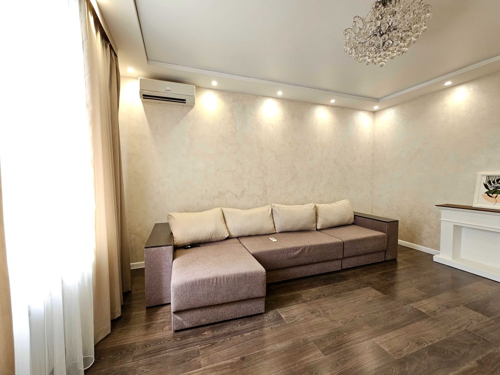 В спальне есть угловой шкаф, двуспальная кровать и кондиционер. В гостиной установлен удобный угловой диван, смарт‑телевизор и тумба для хранения. Кухня оборудована встроенной мебелью, варочной панелью, вытяжкой, микроволновкой, холодильником, столом и стульями.