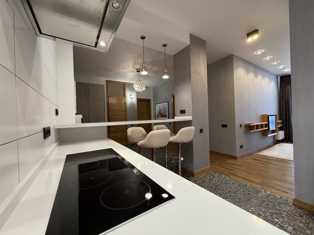 · Простора кухня-вітальня з панорамним остекленням, що забезпечує прекрасну освітленість та відкриває мальовничий вид.