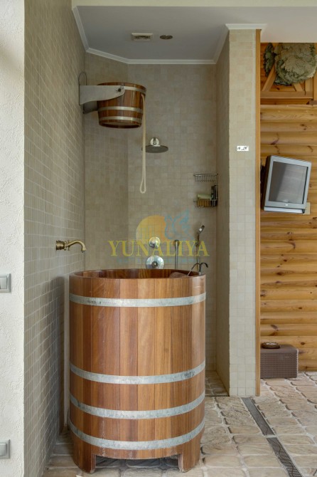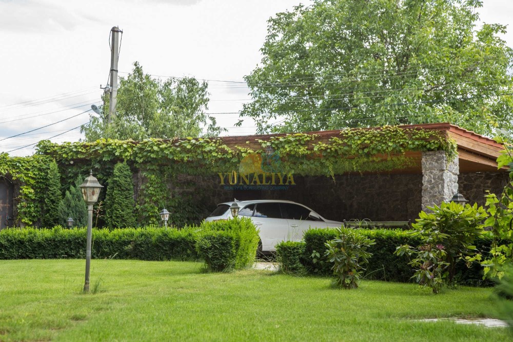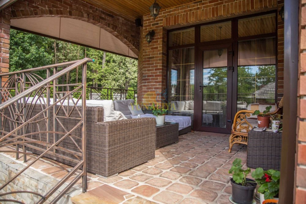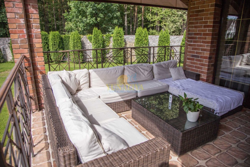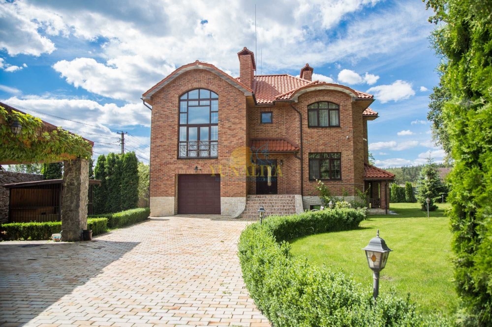 Без комиссии! Дом со всеми автономными коммуникациями, мебелью и техникой, 8 км от Киева по Новообуховской трассе. Расположен на участке 17 соток, огражден высоким каменным забором. Граничит с соседями с одной стороны, с остальных сторон лес. Общая площадь 425 кв. м. Планировочное решение: 1 этаж – открытое пространство гостиной с камином и кухни-столовой с выходом на просторную террасу, гостевой с/у, SPA зона с сауной и бассейном 7х3 метра с противотоком и переливом, гараж; 1,5 этаж – детская со вторым светом; 2 этаж – 3 спальни, главная спальня с гардеробной и ванной комнатами, с/у; подвал – тренажерный зал, S - 25 м² с полным комплектом тренажеров, котельная, прачечная, кладовые. В с/у: 3 душевые кабины, угловая ванная Jacuzzi с мебелью «VilleroBoch». Техника: 3 плазменные панели, кухонная бытовая техника «SIEMENS» (духовой шкаф, пароварка, кофемаишина и пр.). Коммуникации: канализация - 2 выгребные ямы, общая система кондиционирования, 2 котла (газовый и сухое топливо), генератор мощностью 37 кВт , мультимедийная система мультирум, 2 спутниковые тарелки, системы теплых полов, системы очистки воды. Территория ухожена, небольшой сад, система автоматического полива, домик для барбекю. Удобный заезд с Одесской и Новообуховской трассы, либо через с. Хотов (до центра 15-20 мин). Внешняя и внутренняя отделка: материалы полов массив дерева, камень, плитка; стены фактурная штукатурка, венецианка, инкрустация деревом.