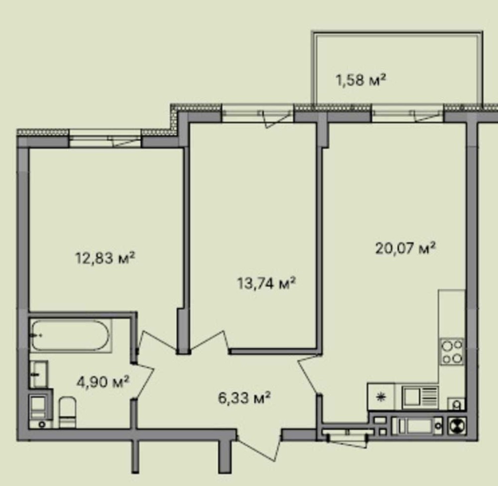 Складається з двох окремих кімнат, просторої кухні-вітальні з виходом на відкритий балкон та суміжного санвузлу.