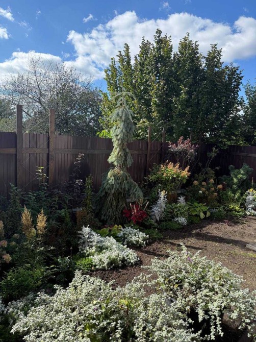На участке растут хвойные деревья.