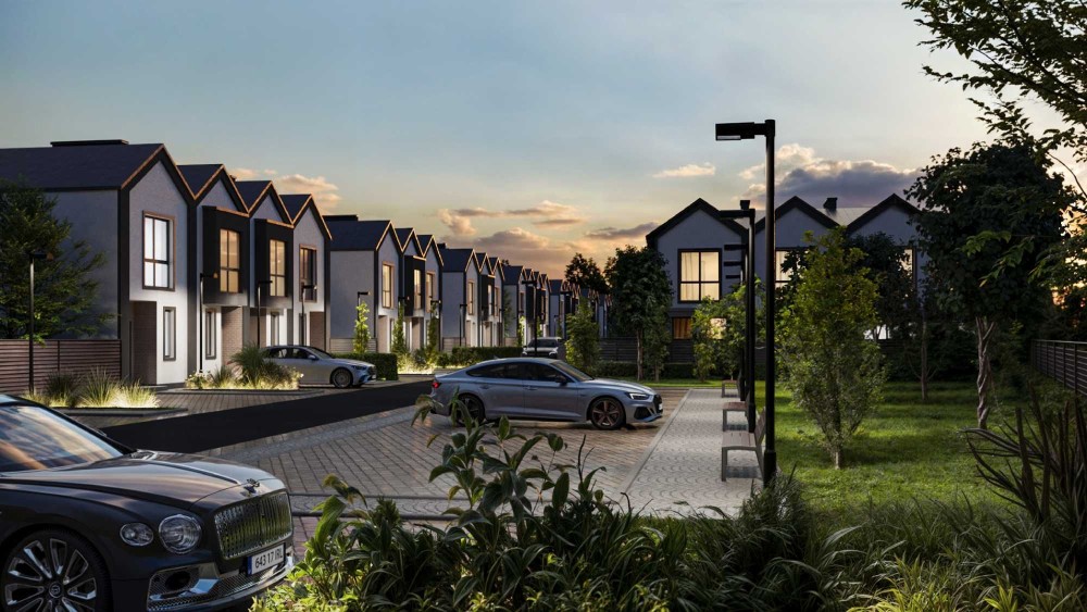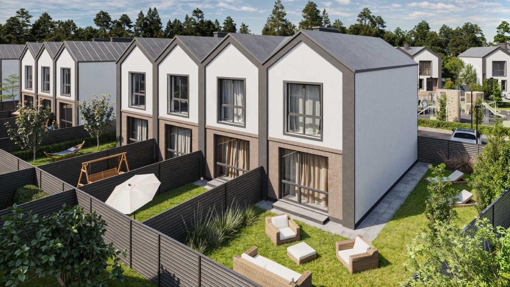 • Простір та комфорт: На території площею 2,14 га розташовано 112 сучасних таунхаусів площею 68, 69 та 100 м², кожен із власним двориком та паркомісцем.