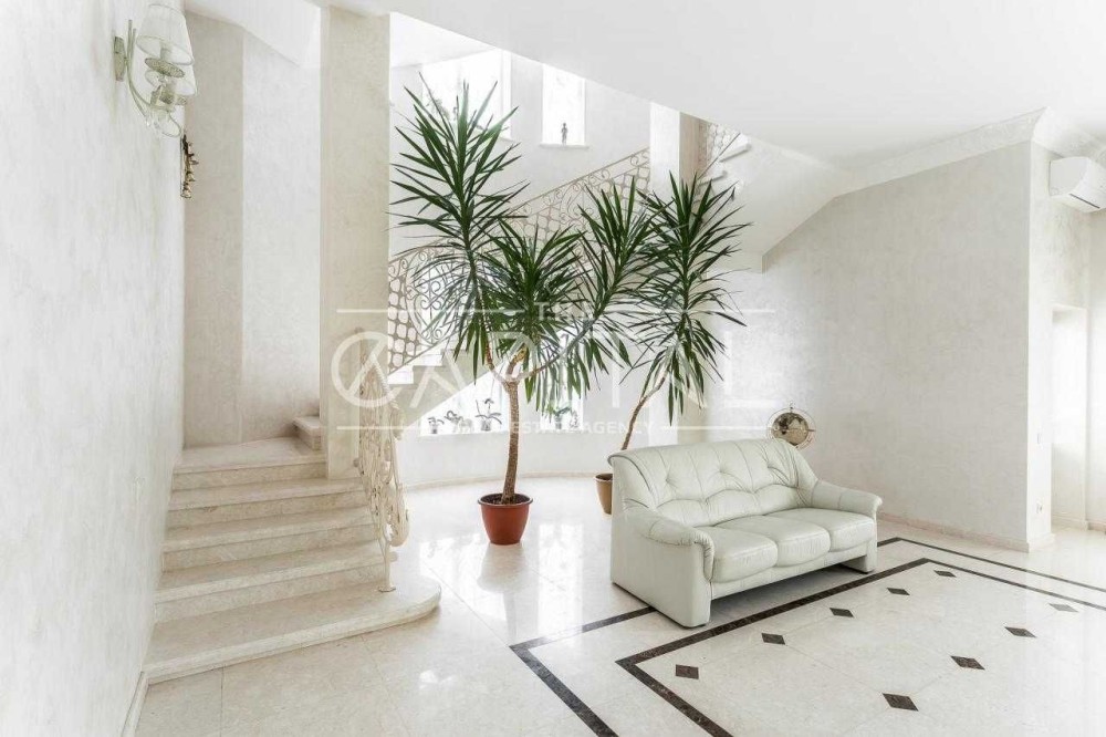Дом построен из кирпича обслуживании экономичен. Наружная отделка дома – иранский травертин и гранит. Внутренняя отделка – полы и лестницы из мрамора, полы в спальнях из натурального массива.