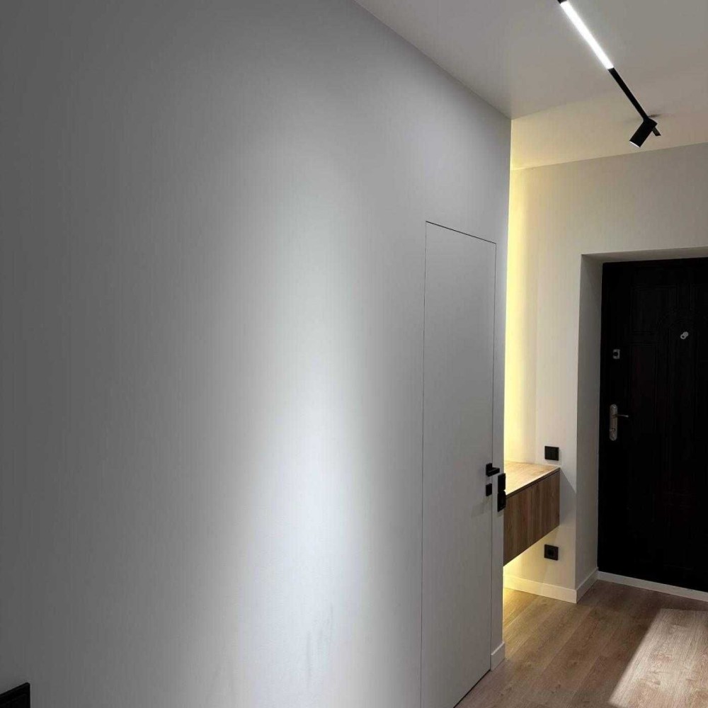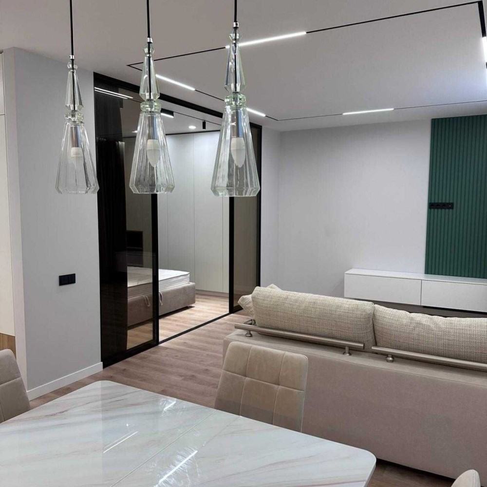 Освітлення: Сучасне точкове та трекове освітлення, а також декоративні підвісні світильники над обідньою зоною.