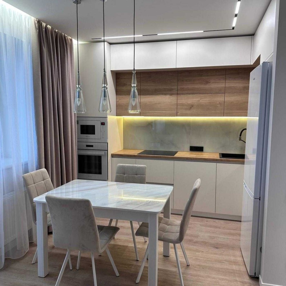 Сучасний дизайн: Інтер'єр виконаний у світлих, мінімалістичних тонах з використанням дерев'яних та білих акцентів, що створює затишну та простору атмосферу.