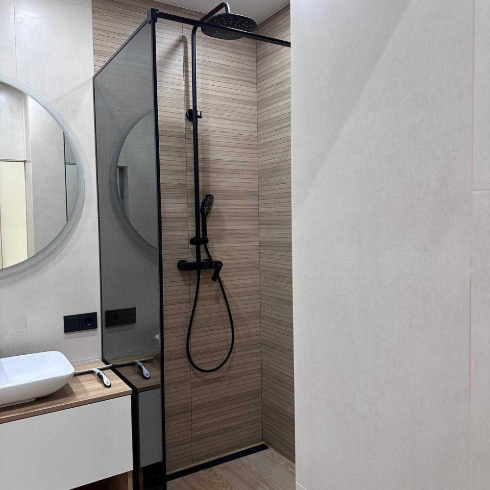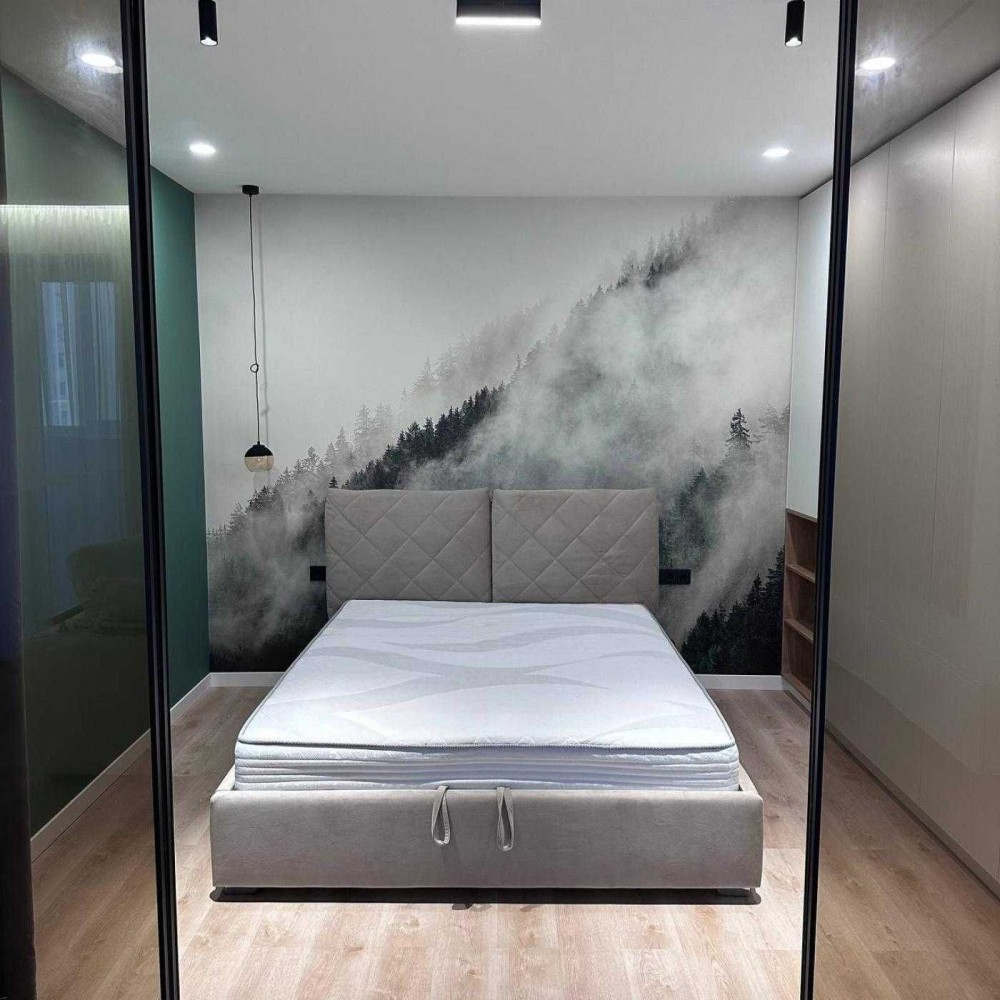 Окрема спальня: Відділена від вітальні стильними скляними розсувними перегородками з чорним каркасом, що додає простору та світла, зберігаючи при цьому приватність. Акцентна стіна зі шпалерами, що імітують туманний ліс, створює особливу атмосферу відпочинку.