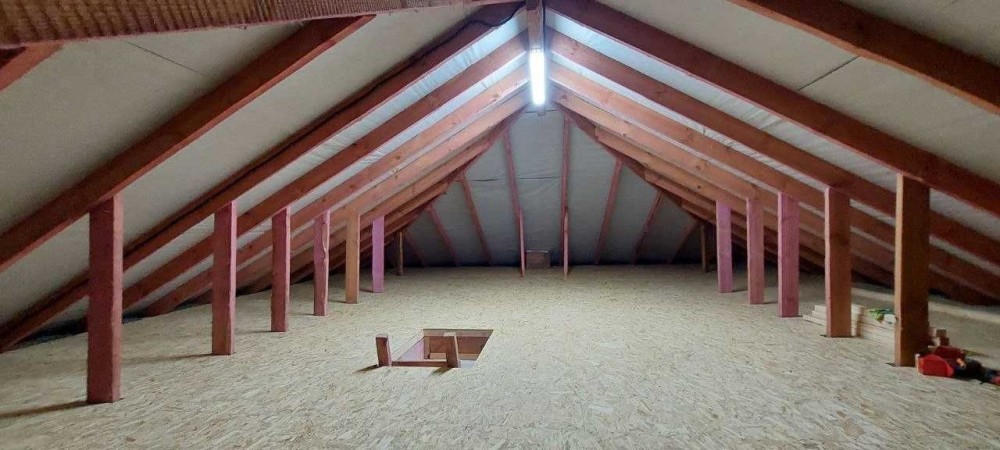 Установили автоматику на ворота, зашили навес веранды, развели электрику и сделали машинную штукатурку, утеплили чердак минватой и зашили пол чердака ОСБ.