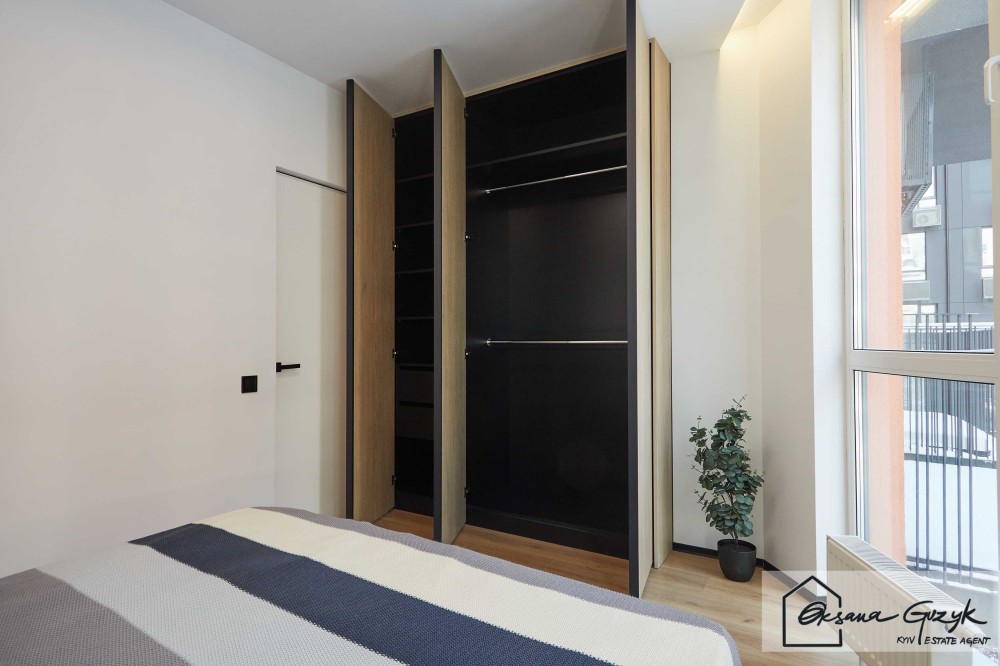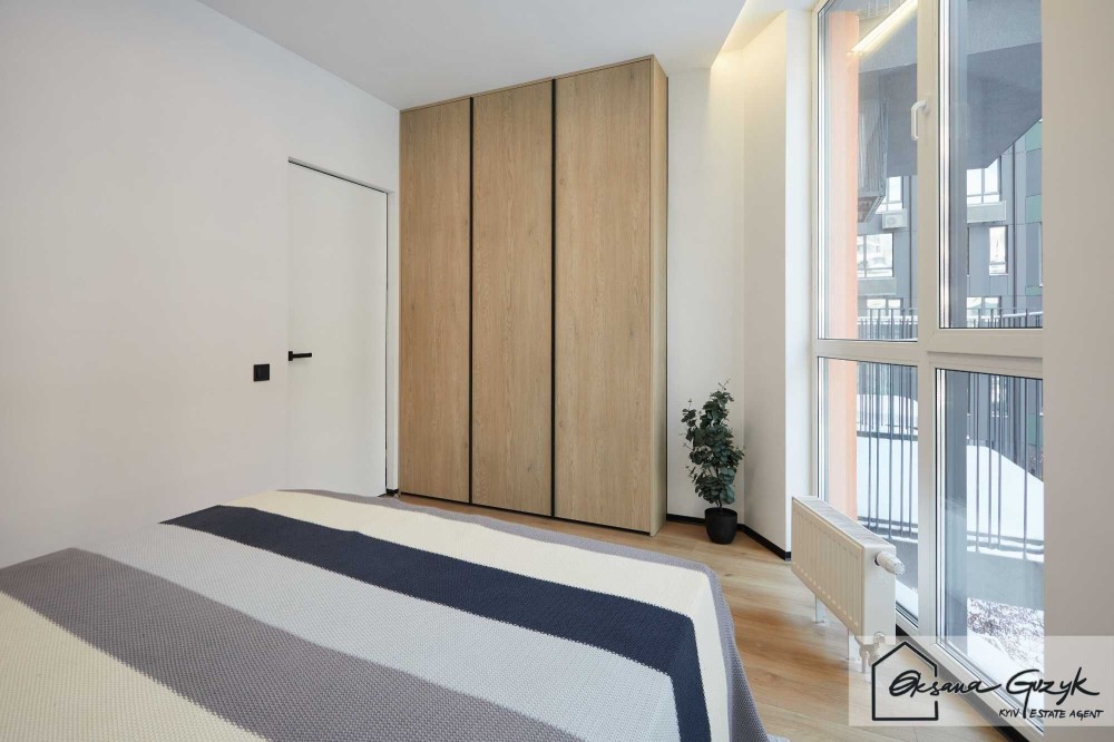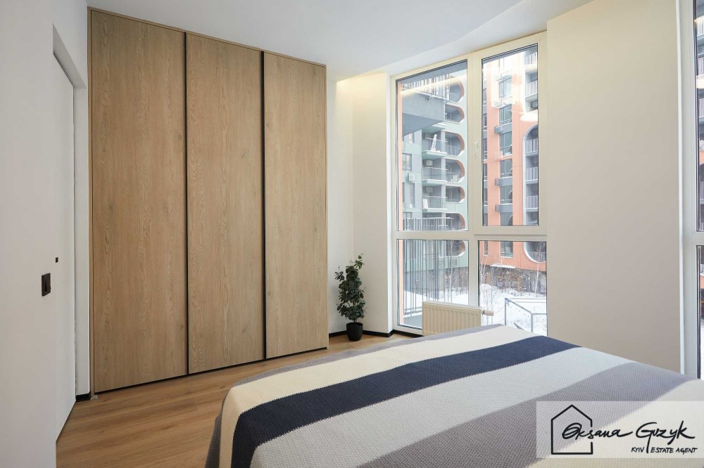 Спальня — це Ваша кімната відновлення, яка світла завдяки панорамним вікнам, комфортна завдяки двоспальному ліжку, а тепле дерево шафи створює атмосферу без надлишкових акцентів. Тут домінує не декор, а відчуття.