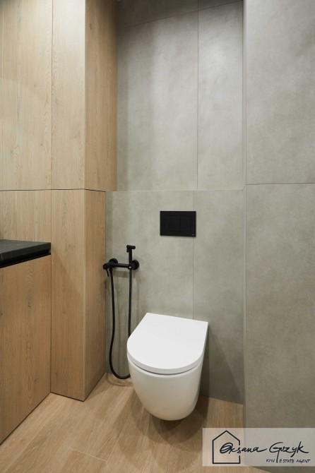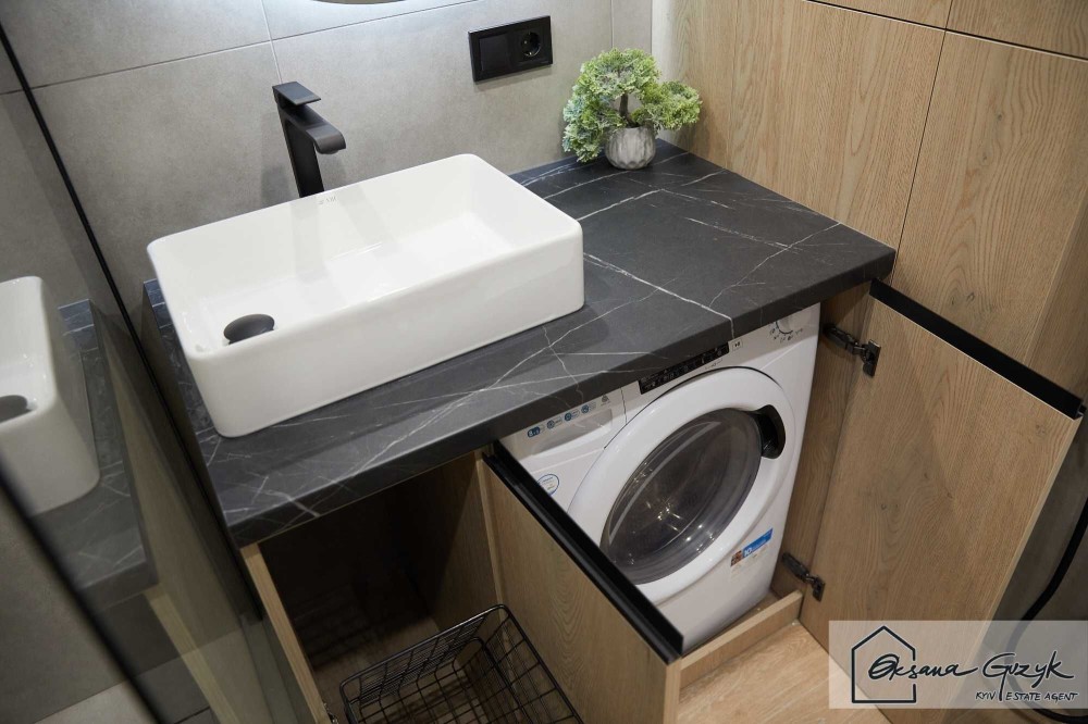 Санвузол компактний але функціонально насичений, адже у ньому розмістили просторий душ, який орієнтований на комфорт щоденного використання, а ще інтегровано водонагрівач, пральну машину з корзиною для білизни, рукомийник та унітаз і гігієнічний душ.