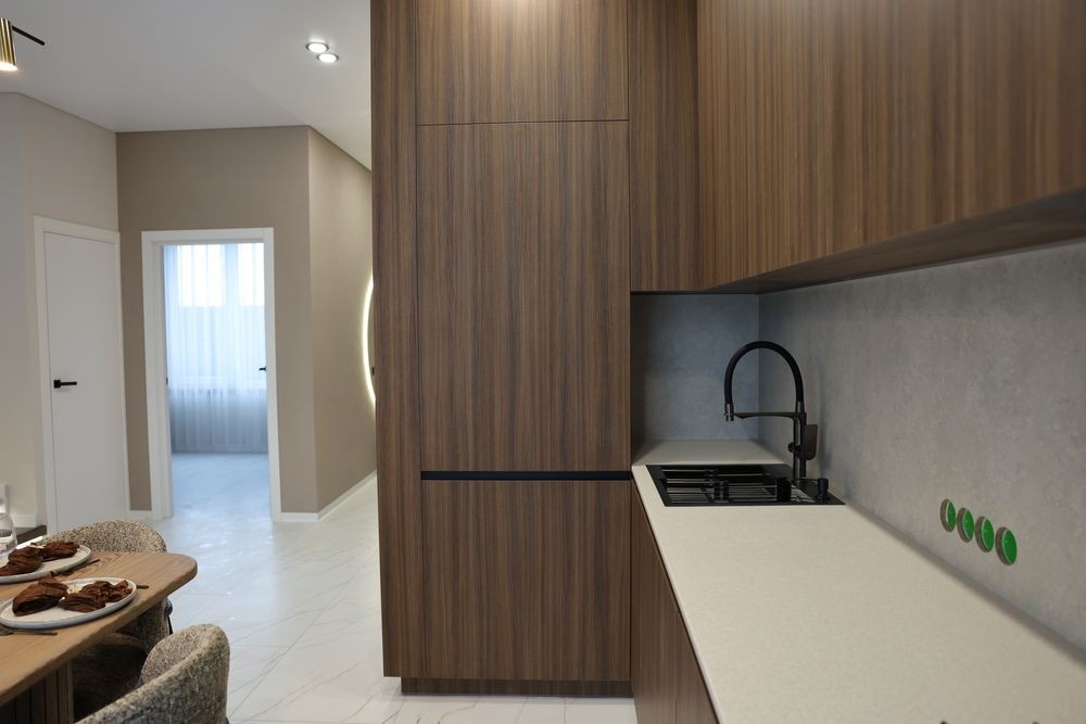 Є вся вбудована техніка: холодильник широкий 70 см, посудомийна машина, газова плита, духова піч)