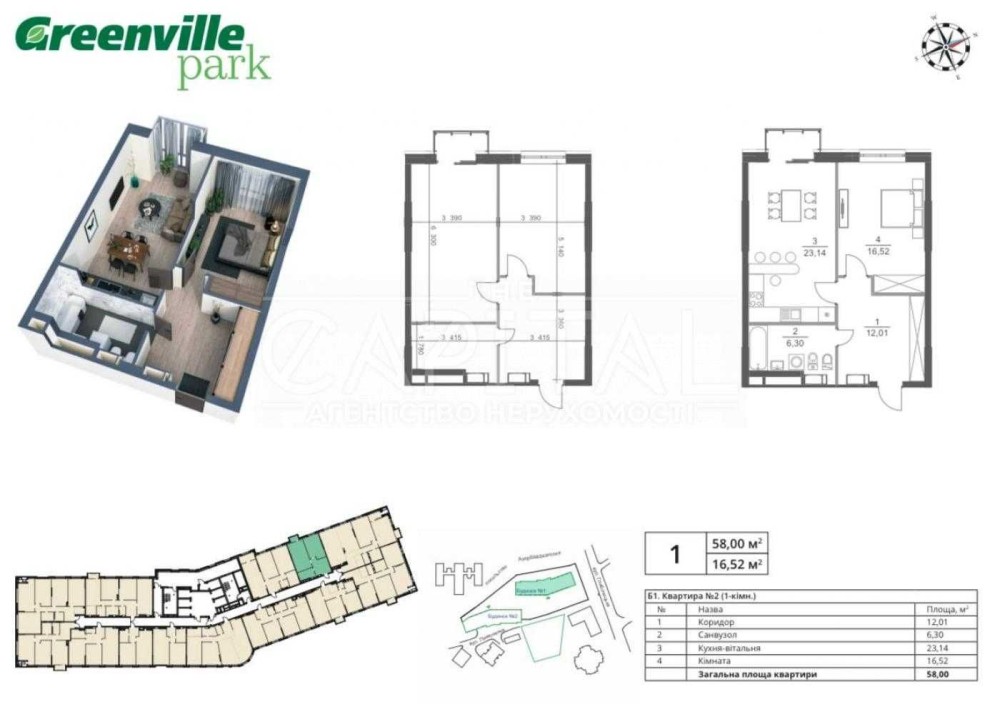 Видова 1 кімнатна квартира ( 58 м2 ) в житловому комплексі бізнес-класу Greenville Park від надійного забудовника "Greenville".