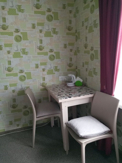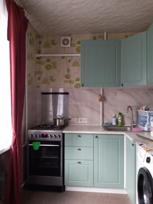 В кімнаті знаходиться: 2 дивани, крісло, холодильник, кухонні меблі. Також є пральна машина автомат.