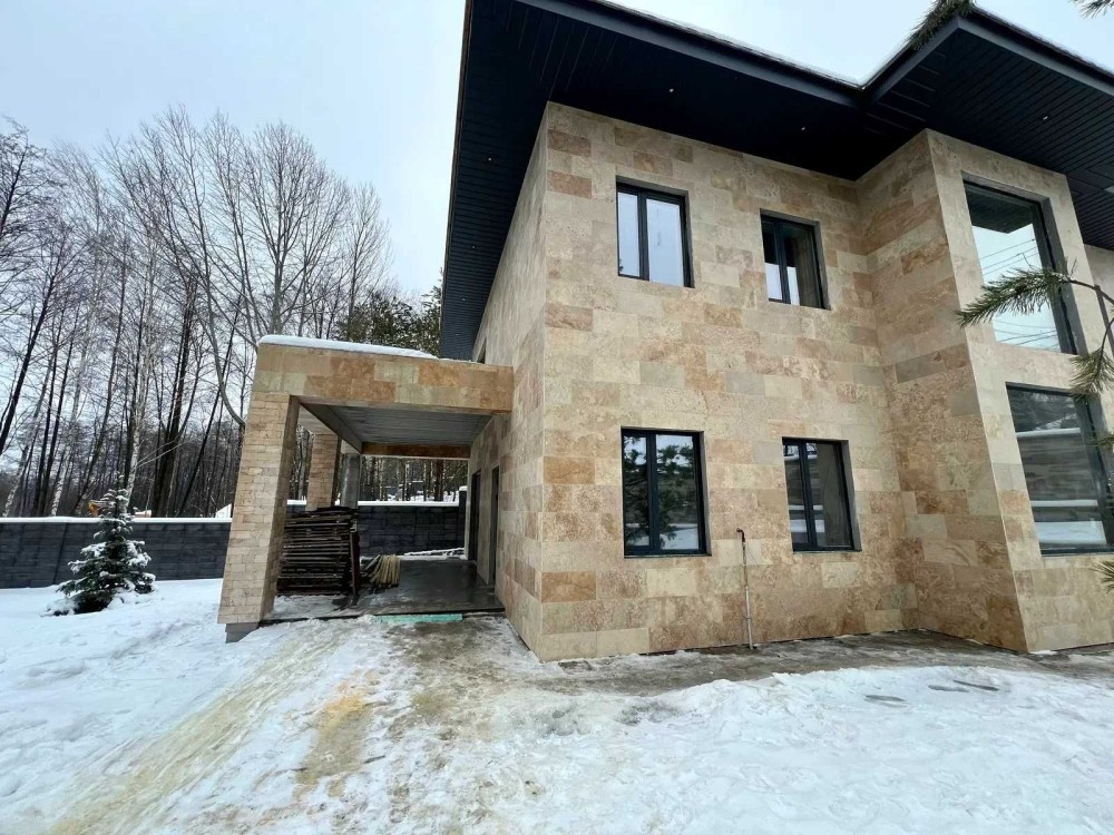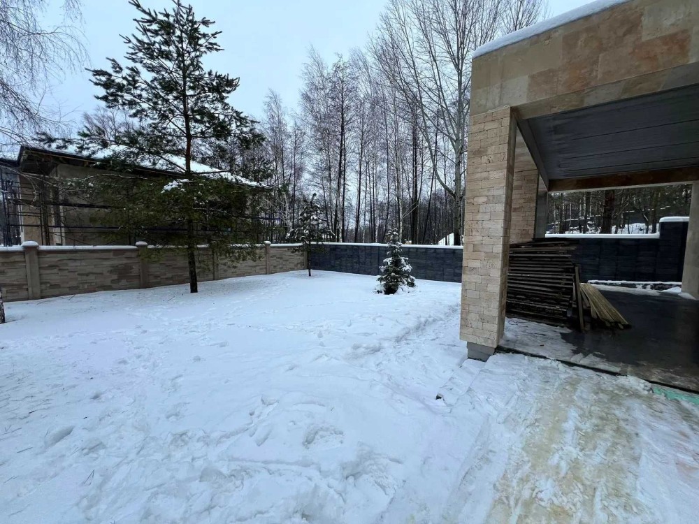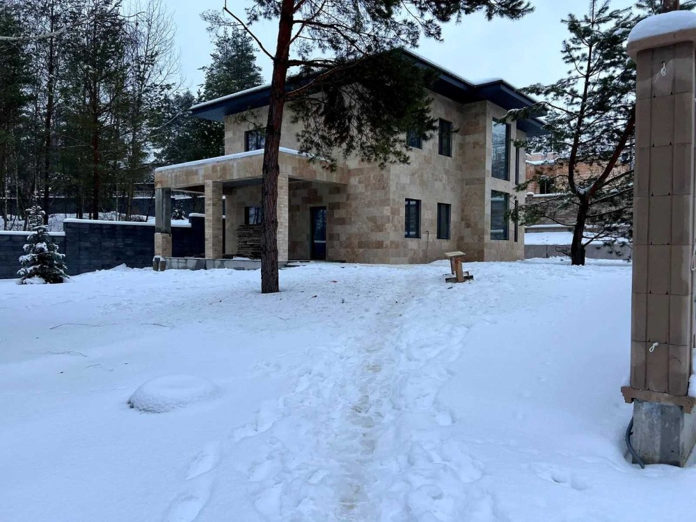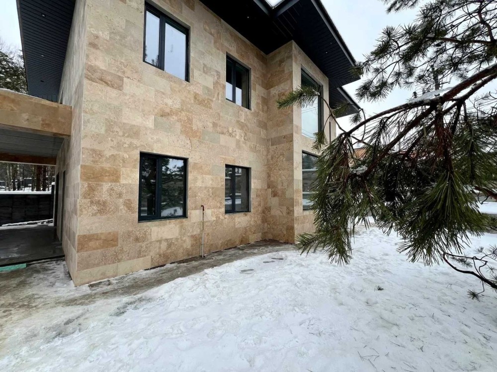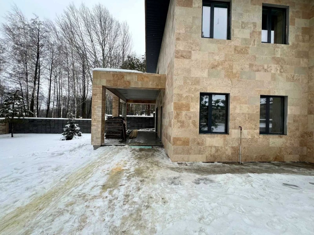 Навіси на 2 авто , вікна алюміній , фасад - травертин + термодерево , паркан натуральний камінь Патіо , авто полив + рулон й газон , сосни.