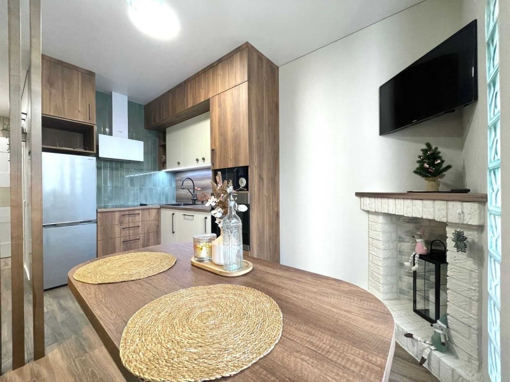 В квартире есть вся необходимая мебель и техника- стиральная машина, холодильник, телевизор, колонка.