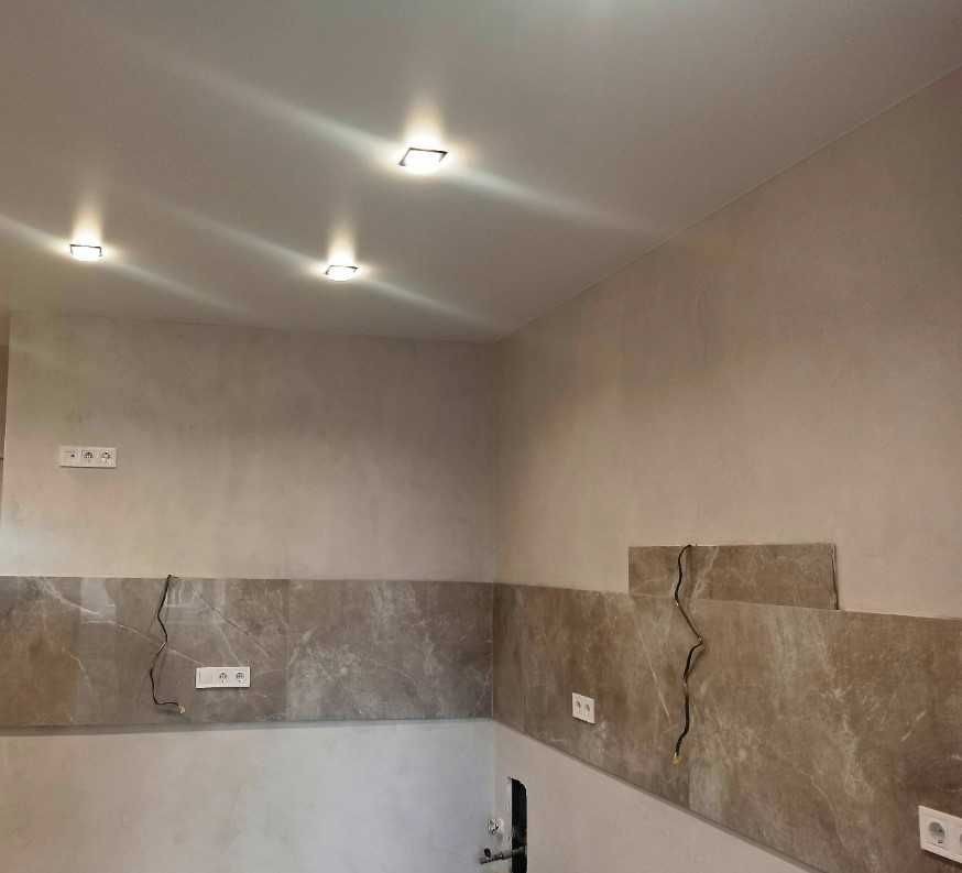 Стены декоративная штукатурка в пастельных тонах. Дорогие подвесные потолки со встроенным светом.