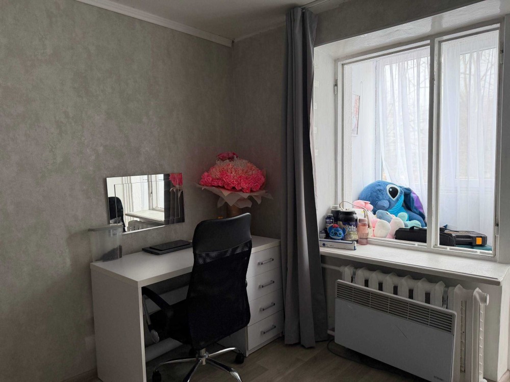 Затишна компактна квартира у п’ятиповерховому блочно-цегляному, газифікованому будинку. Зручний поверх, вдале планування: квадратна кімната, просторий засклений балкон. Вікна на північний схід — влітку приємна прохолода.