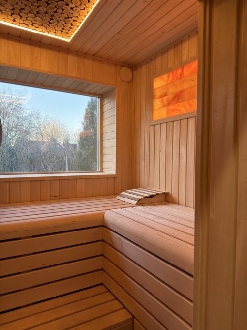 Зі вставками з гемолайської солі, підсвічуванням, на стелі декор з кедра. Головною родзинкою в сауні є велике вікно з видом на великі ялини та сосни. Коли йде сніг, то вигляд особливо казковий.