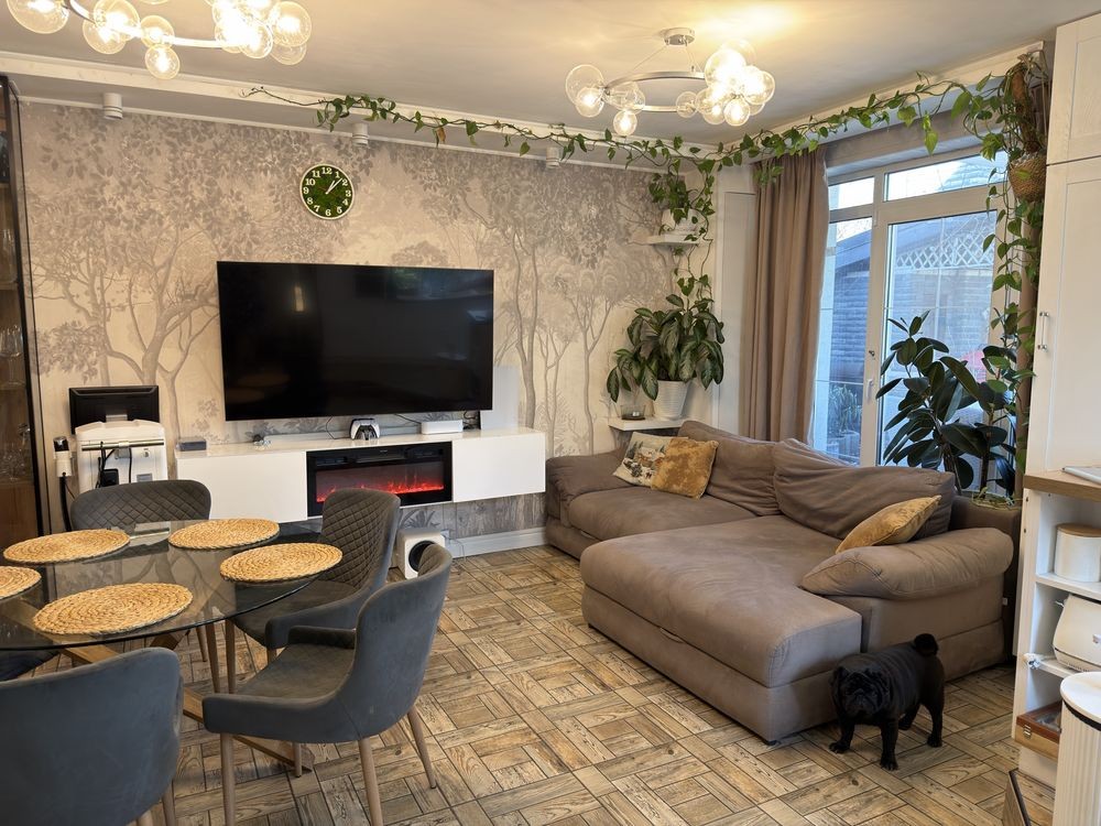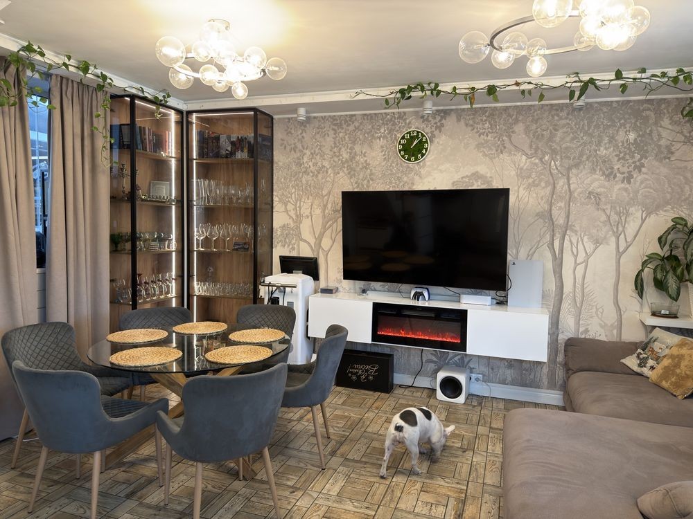 Велика вітрина під бар, посуд чи бібліотеку. Підвісна тумба камін. На центральній стіні - шпалери з авторським дизайном.