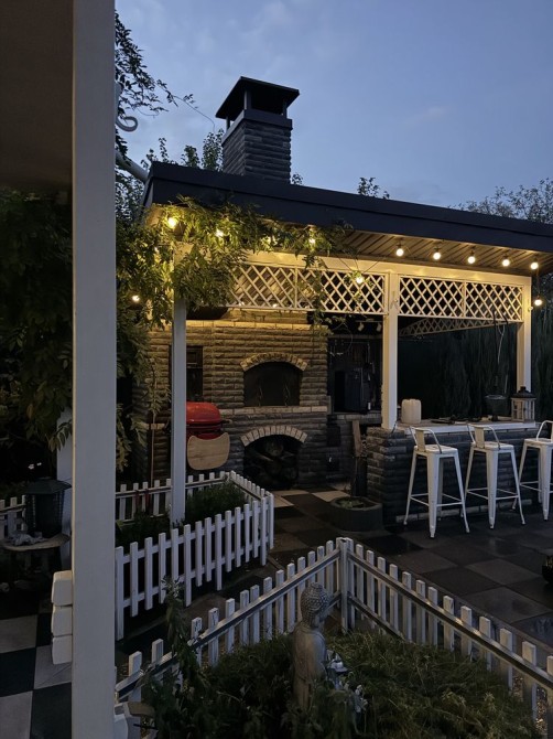 Мангальна зона: піч, місце під казан, коптильня. Місце під бар та приготування. Поруч клумби з пряними травами.