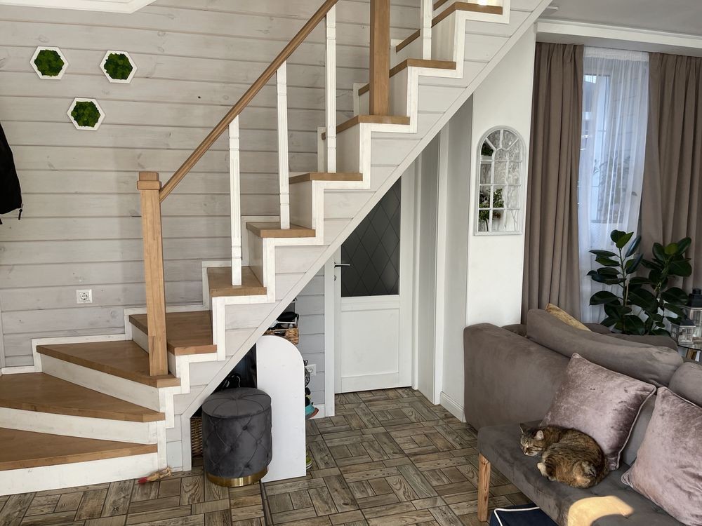 Сходи на другий поверх: каркас метал, щаблі бук, обшита сосною.