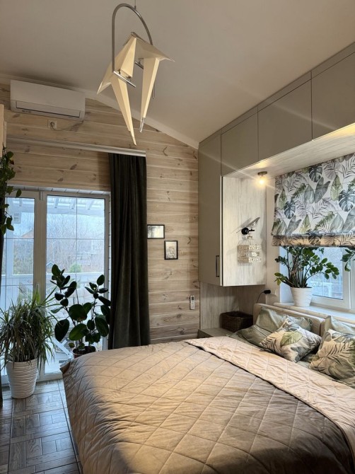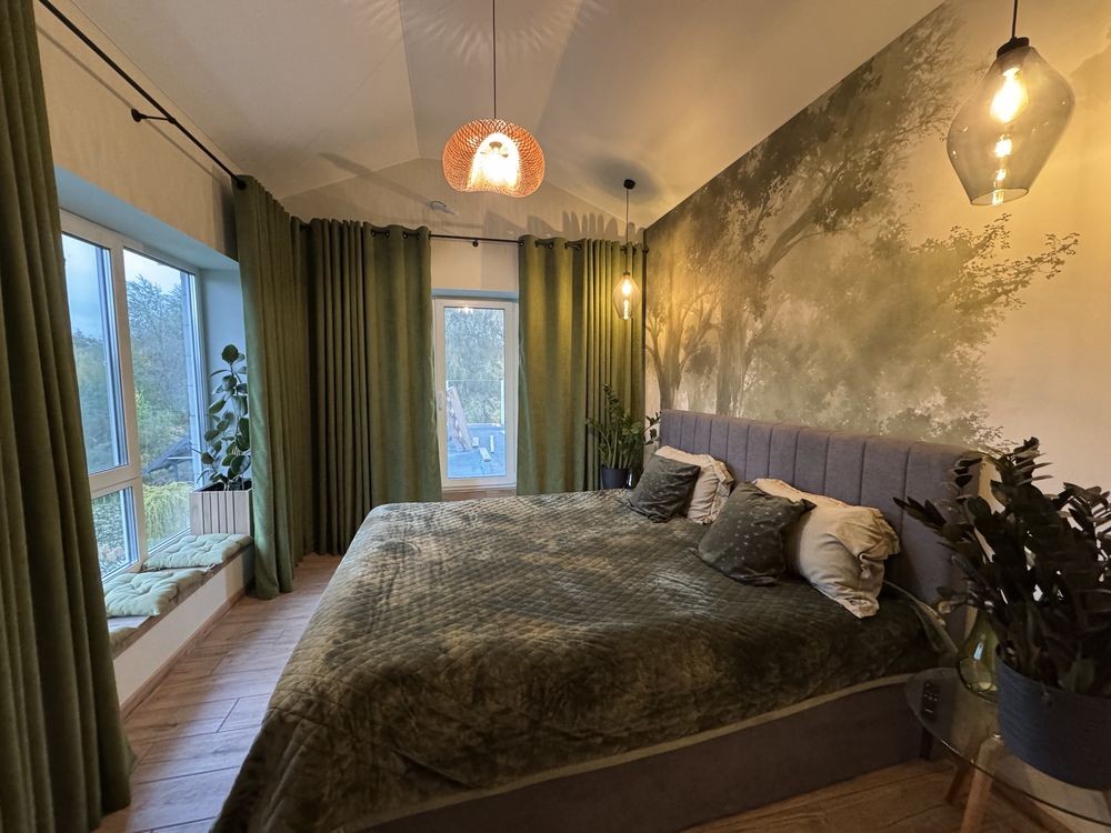 Другий поверх: спальня з великими понорамними вікнами та виходом на терасу 25 кв м. З видом на річку та сад.