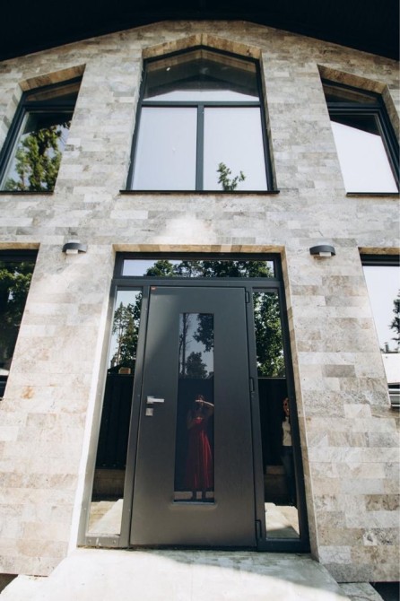 Фасад і вся прибудинкова територія з натурального травертину — виглядає дорого, живе вічно.
