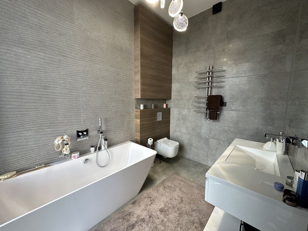 3 окремі спальні. 2 сан вузла ( ванна і душова) Гардеробна. Кладовка. Великий холл з кухнею. Високі стелі: 3.20 і всі панорамні вікна . Будинок дуже світлий і просторий. Кухня фірми Roda з вмонтованою технікою бош і вірпул. Італійська камяна столешня. Електричне опалення( 30 клв). 3 кондиціонерів. Двері прихованого монтажу, алюмінієві вікна. Підігрів підлоги всюди де плитка. Всі центральні комунікації. Побудований з цегли повнотілоі, утплення пінопласт 10, дах- мембрана баудер, утеплення 25. Своя насосна станція. Ділянка 6 сотин. З шикарною панорамою на місто, ландшафтним дизайном і зоною для барбекю. Ворота на автоматиці, сигналізація. Є підвал.