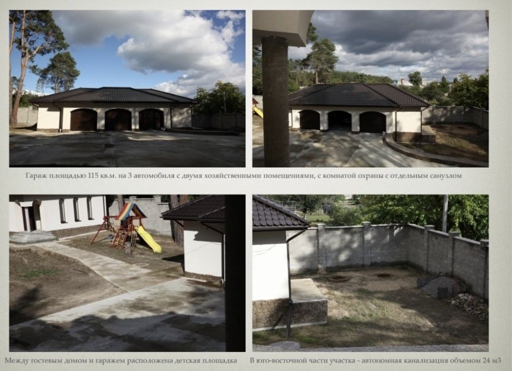 Також на території гараж на 3 авто площею 115 кв.м. приміщенням для охорони та санвузлом, гостьовий будинок площею 83 кв.м. з двома погребами, альтанка, мангальна зона.