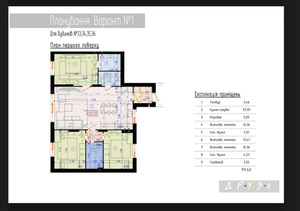 Загальна площа 97м2 з просторою кухнею-вітальнею майже 40м2 із висотою стелі 4 метри