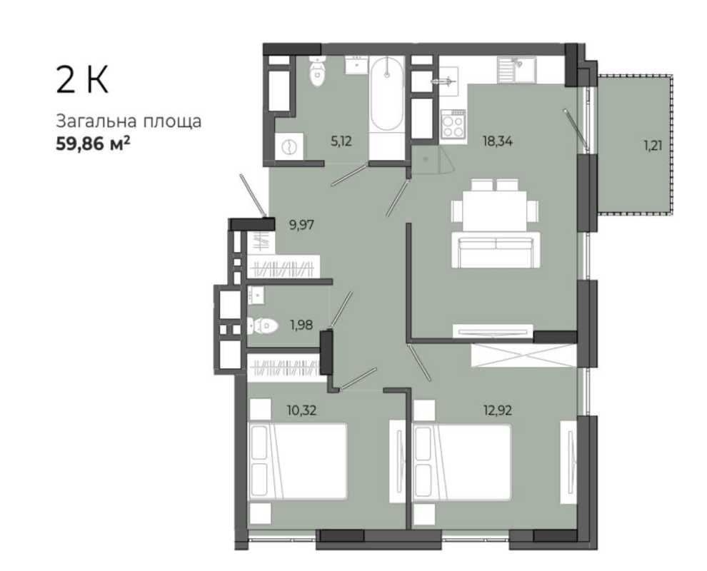 власна гардеробна — забудьте про громіздкі шафи в кімнаті, сумісний санвузол та просторий передпокій.