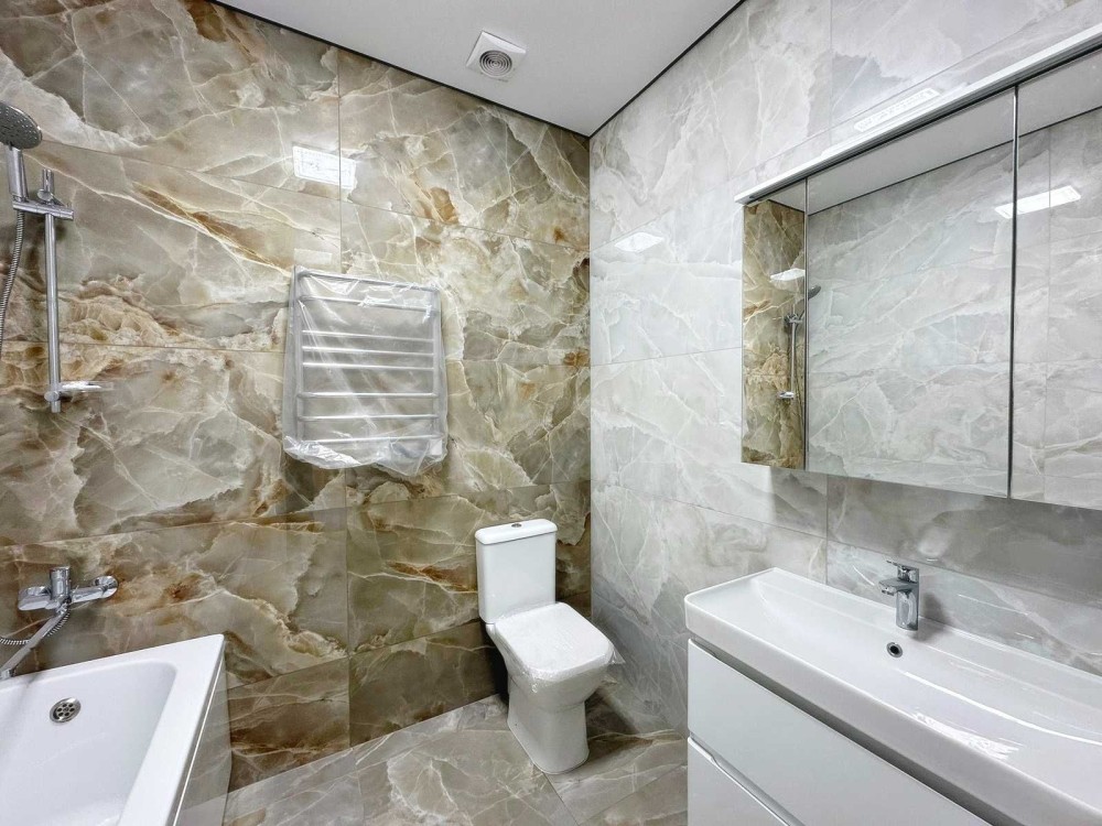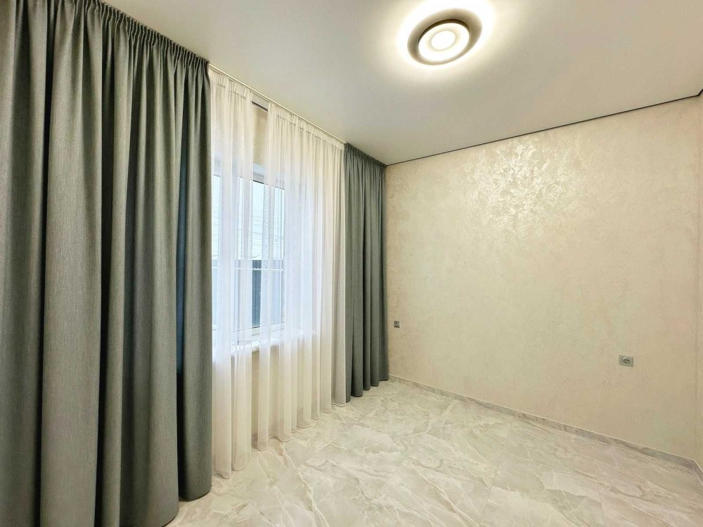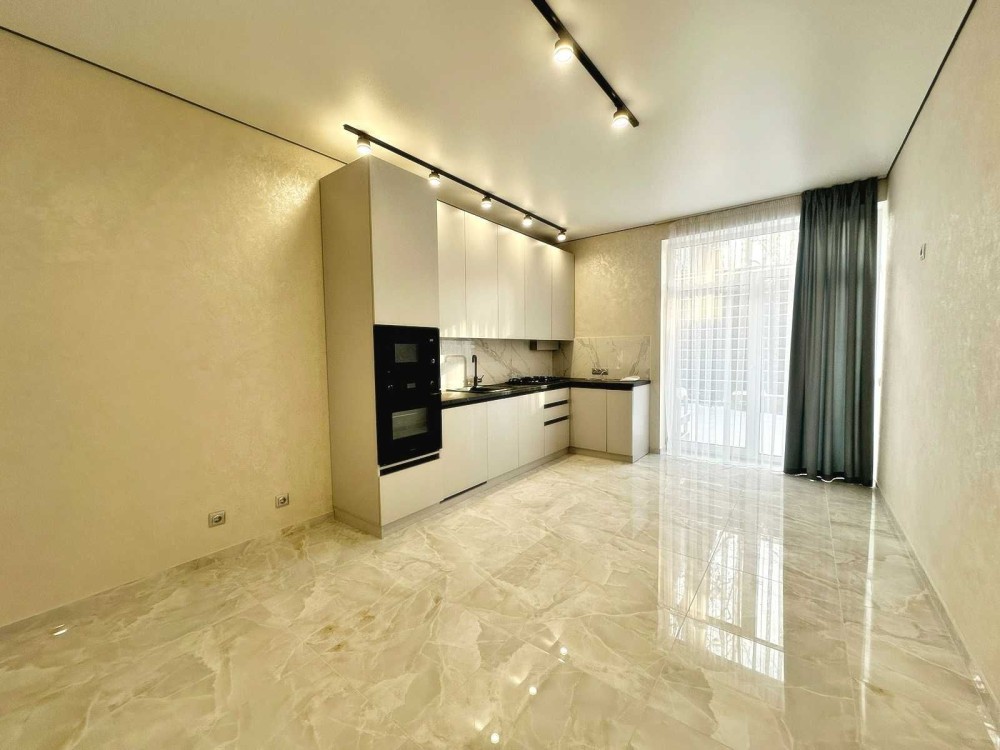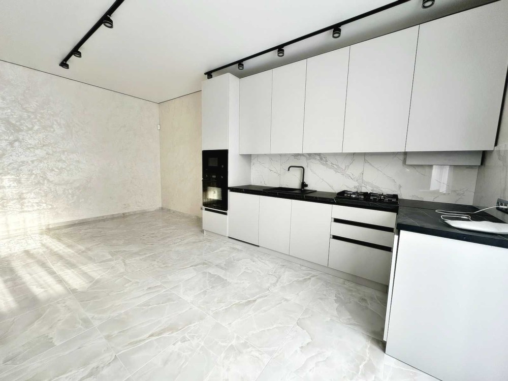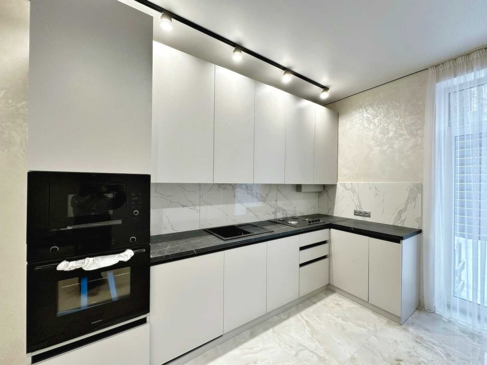 Зроблено ремонт у світлих тонах, на кухні встановлена вбудована кухня з технікою.