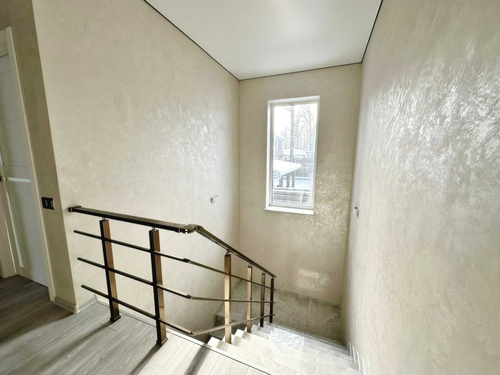 Таунхаус загальною площею 102.6 м.кв., 4 спальні, кухня вітальня з виходом на задній двір, 2 санвузли – гостьовий з зоною під пральну машинку та 2ий з просторою ванною. На другий поверх ведуть бетонні сходи викладені плиткою. Можна додатково зробити вихід на горище та облаштувати для зберігання речей.