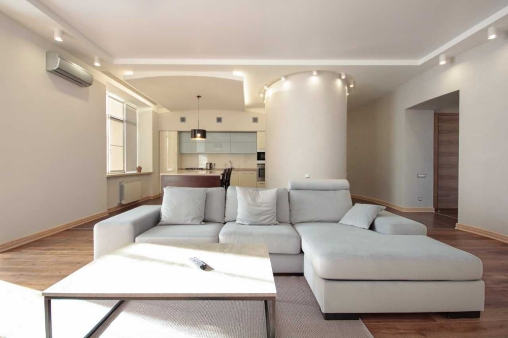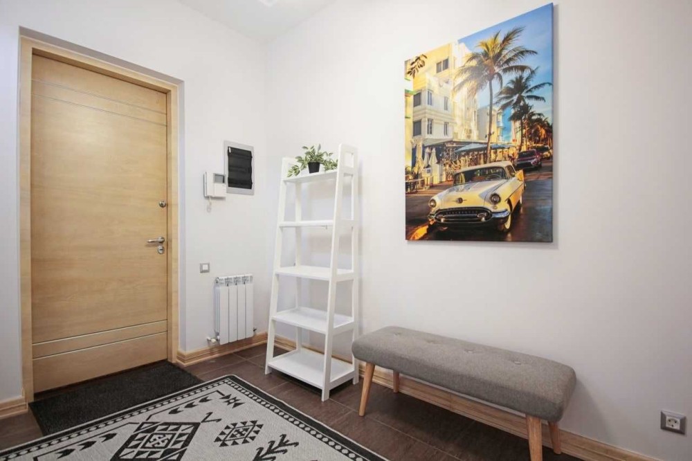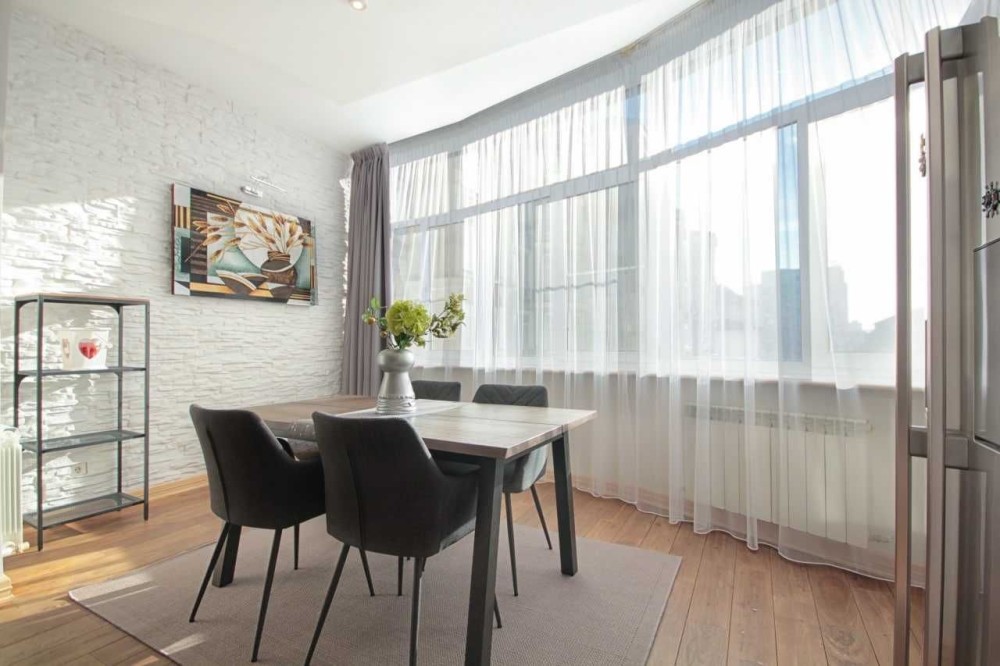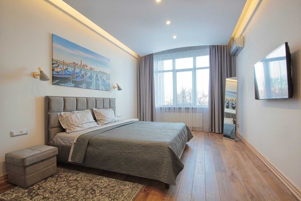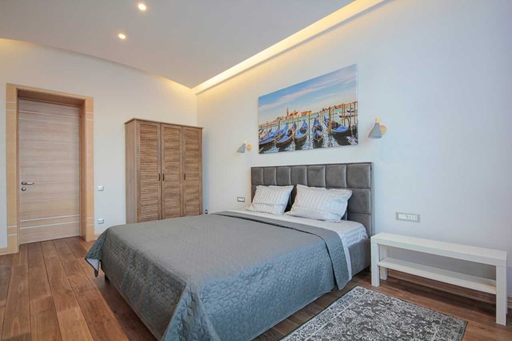 Квартира расположена на 5 этаже, общая площадь 145 м., планировка: студия, две полноценные спальни, просторная ванная комната (ванная и душевая кабина), гостевой санузел. Спальня имеет гардеробную.