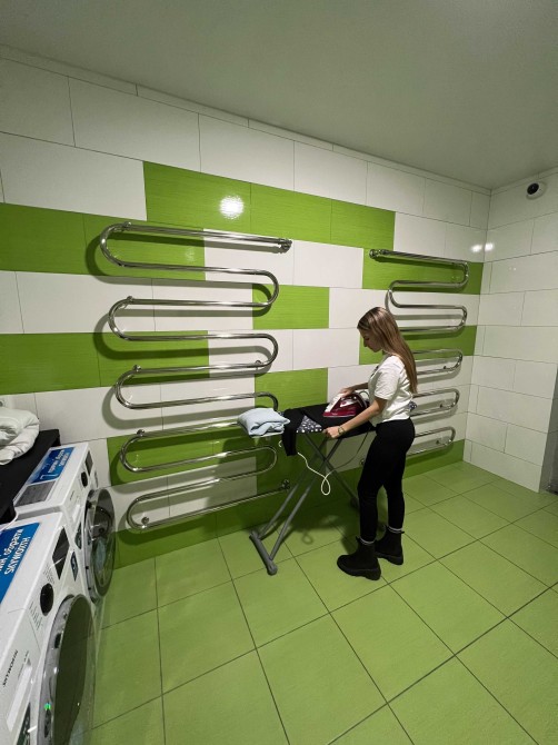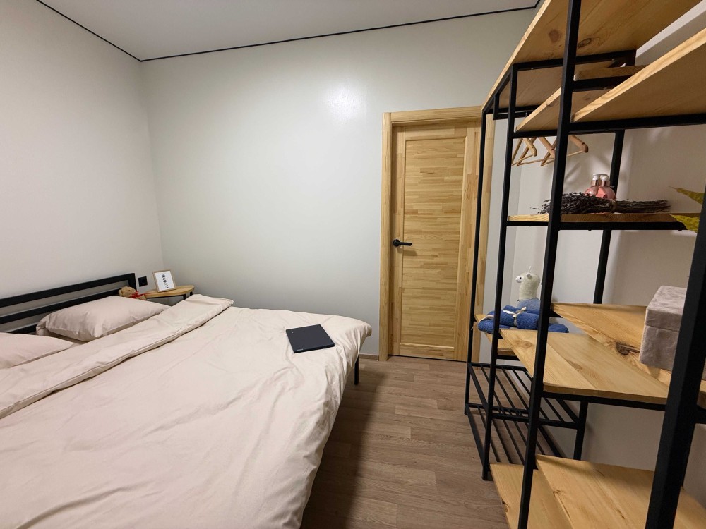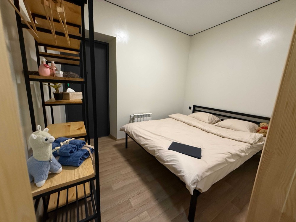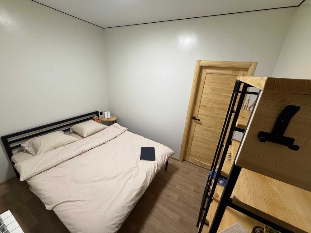 В комнате удобная кровать с ортопедическим матрасом, шкаф и полки для вещей, скоростной Wi-Fi и чистое постельное бельё.