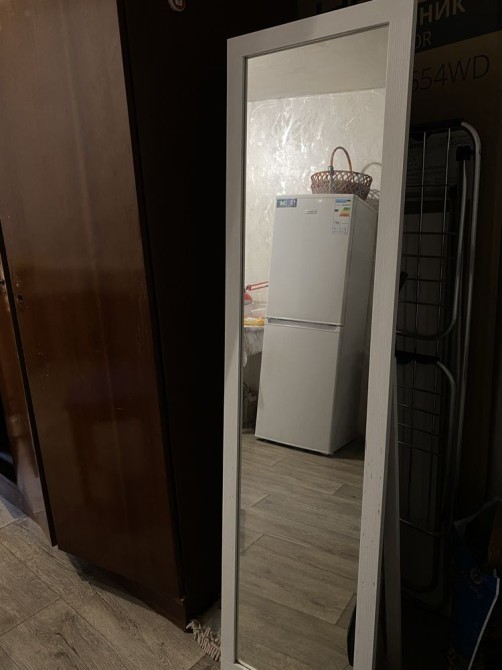 В комнате есть микроволновая печь, диван, кровать, стол-тумба, стол, шкаф, напольное зеркало, НОВЫЙ холодильник и две тумбочки.