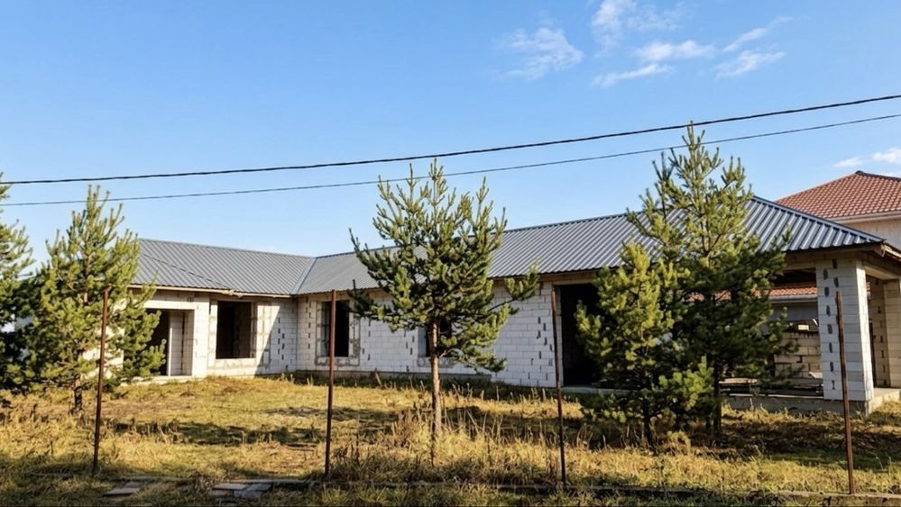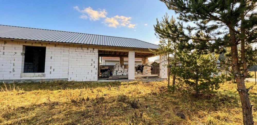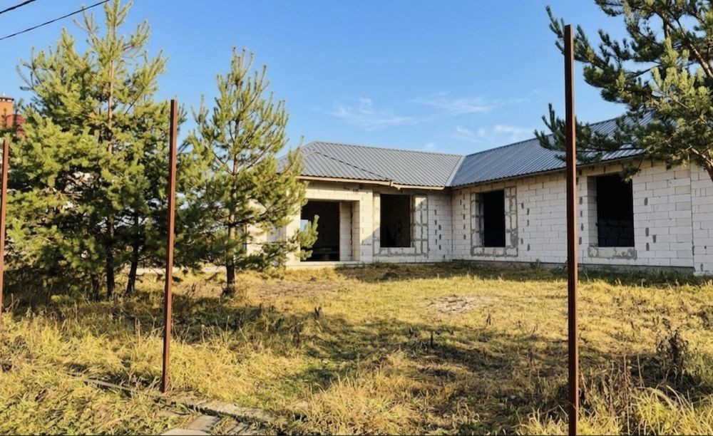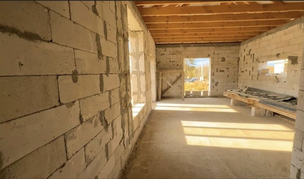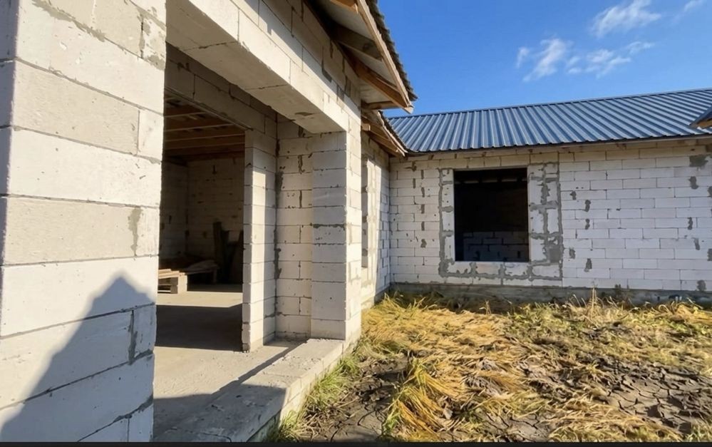 Будинок на етапі будівництва (зведена коробка з покрівлею). Ідеальний варіант для тих, хто хоче завершити під себе, є план як ідея для планування. Також якщо розділити дім на два хазяїна буде по 70 м2 дві частини зі зручним підʼїздом для кожної.