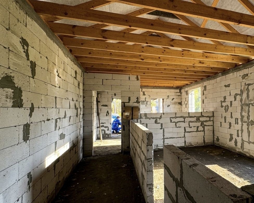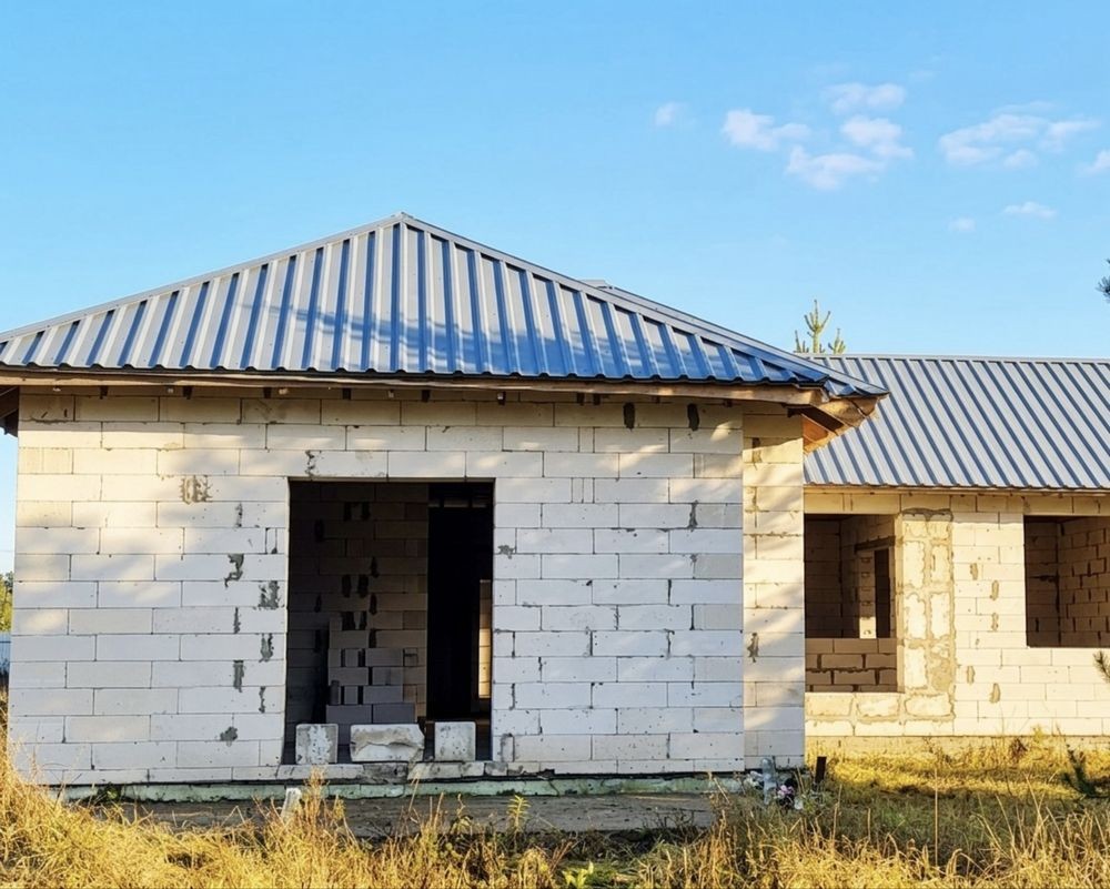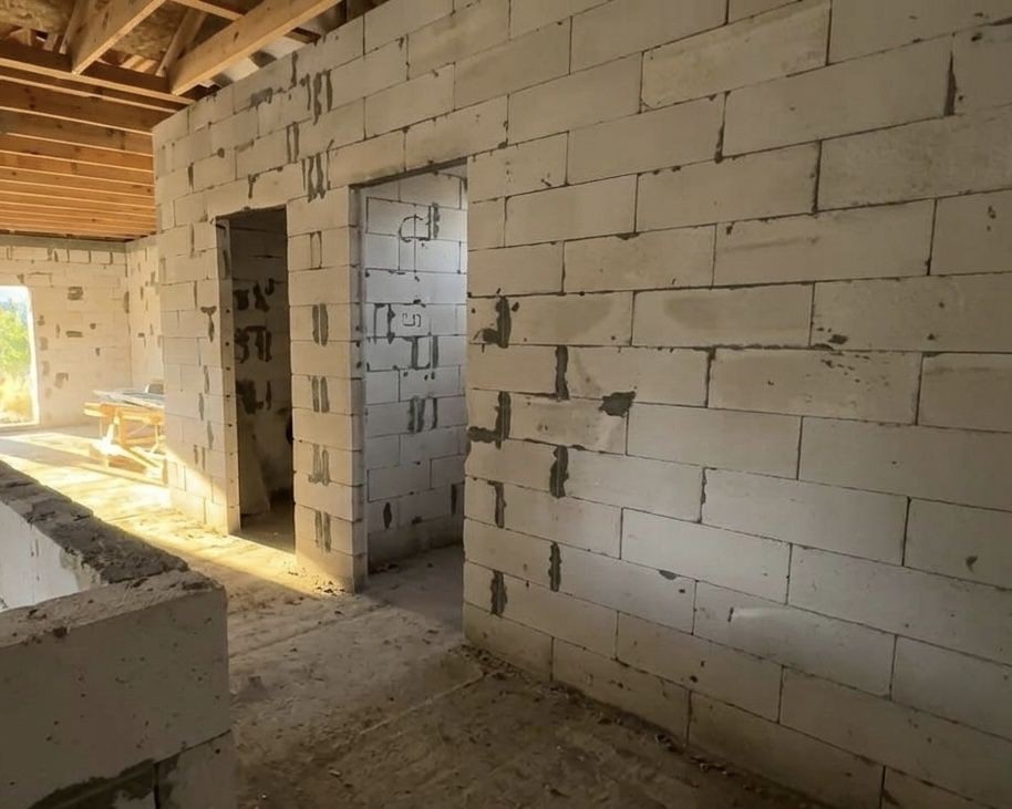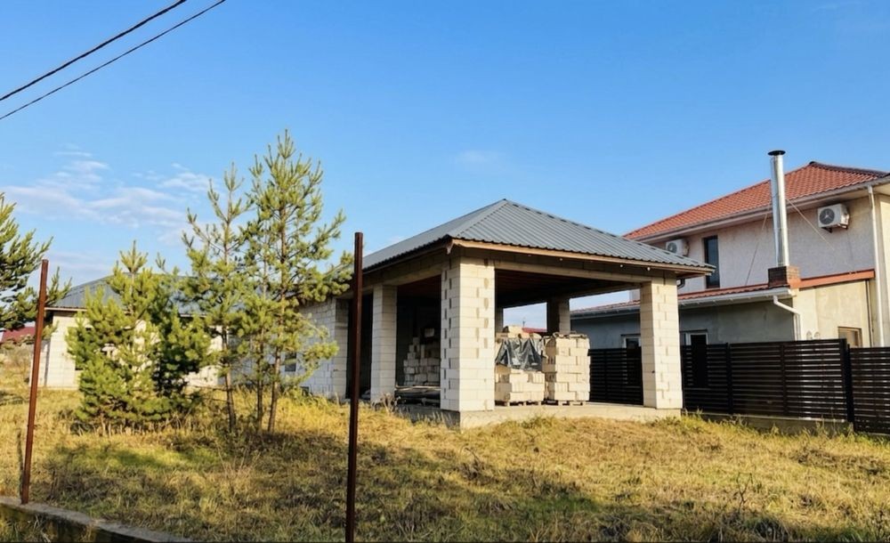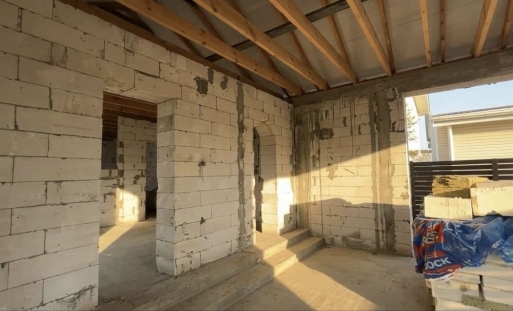 Будинок на етапі будівництва (зведена коробка з покрівлею). Ідеальний варіант для тих, хто хоче завершити під себе, є план як ідея для планування. Також якщо розділити дім на два хазяїна буде по 70 м2 дві частини зі зручним підʼїздом для кожної.