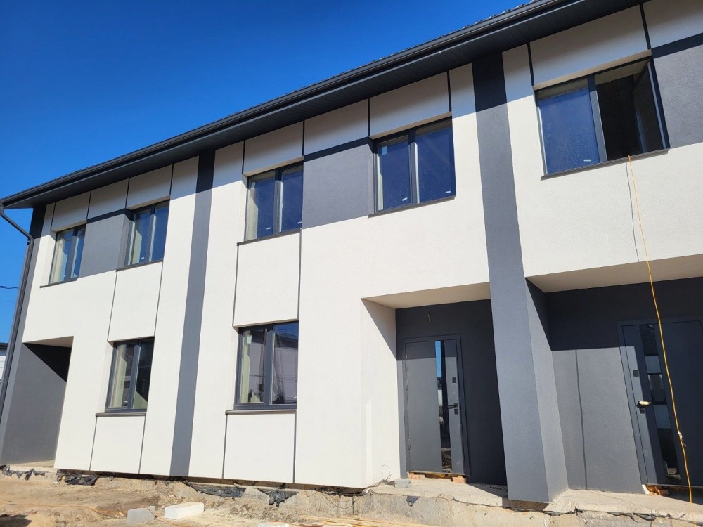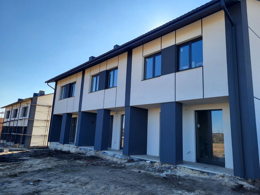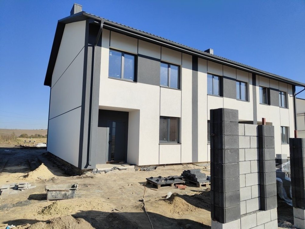 Повністю зроблений фасад будинку, по периметру ділянки залитий фундамент під паркан.