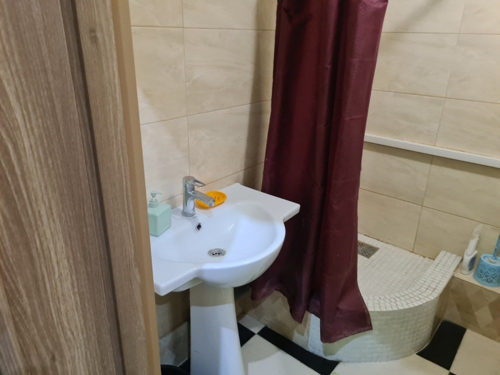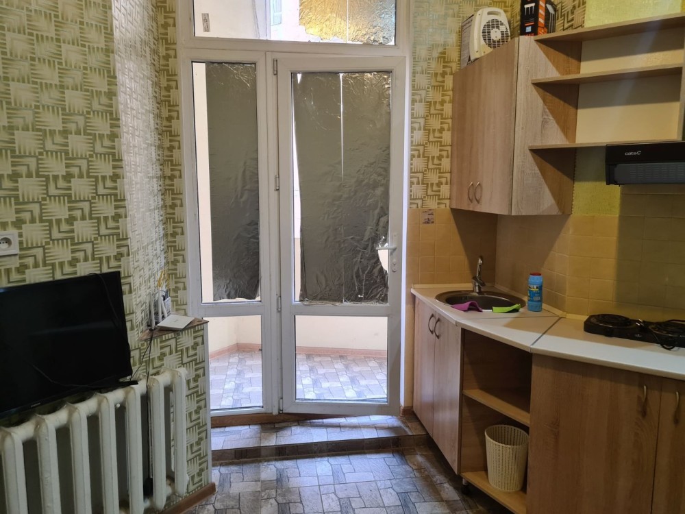 Пушкинская/ Базарная.Красивый старинный дом.Фасад дома на Пушкинскую.Балкон квартиры со стороны двора.Двор закрывается.Вход в квартиру из подъезда.Кодовый замок.Входная зона общая с соседями.Квартира оборудована необходимой бытовой мебелью.Спальное место- раскладной диван.В санузле душ.Квартира студийного планировки.Балкон застеклен.Высокие потолки,толстые стены.Квартира тёплая зимой,нежаркая в зной.Отопление центральное.Двухкомфорная настольная электроплита и микроволновка.Двухкамерный холодильник,стиральная машина,вытяжка,металлопластковое остекление балкона.На полу линолиум.Шкаф отсутствует.Имеется антресоль.