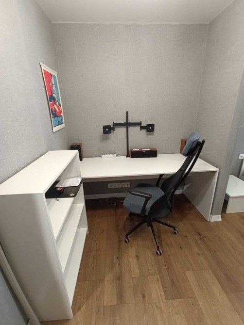 - Меблі: ліжко з матрацом, робочий стіл та стілець, диван, шафа для одягу