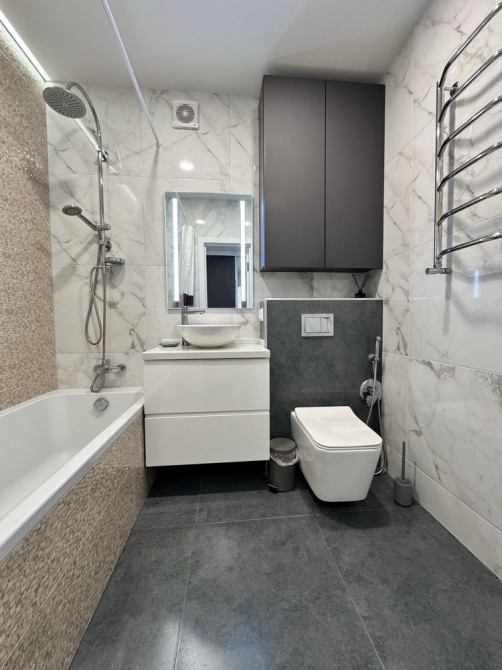 Квартира повністю мебльована та укомплектована побутовою технікою ( холодильник, пральна машина, мікрохвильова, кондиціонери). Тепла підлога, де плитка. Окрема гардеробна кімната.