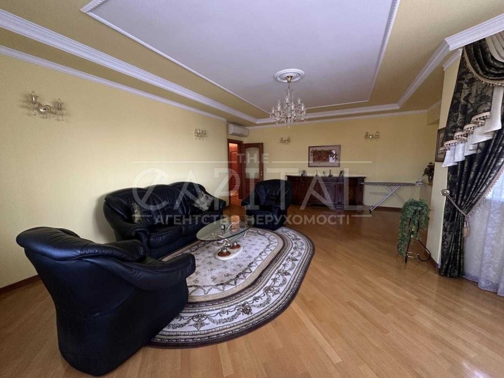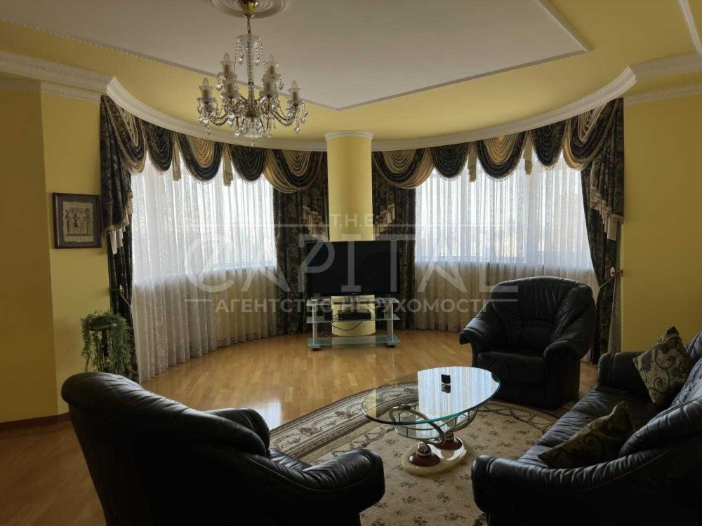 • Простора вітальня з шкіряним м’яким куточком, кришталевими люстрами та панорамним видом на Палац «Україна»