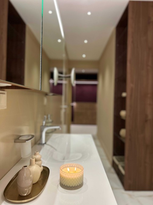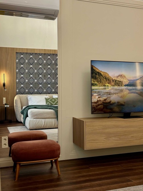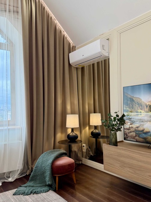У пентхаусі на Оболонській набережній Києва простора вбудована кухня з інверторною плитою, посудомийною машиною, духовкою, потужною витяжкою. У спальнях ліжка з ортопедичними 7 зонними матрацами. Стандарти елітної нерухомості Києва дотримані до дрібниць: колекційні світильники та меблі; простора вбиральня з місткою системою зберігання.