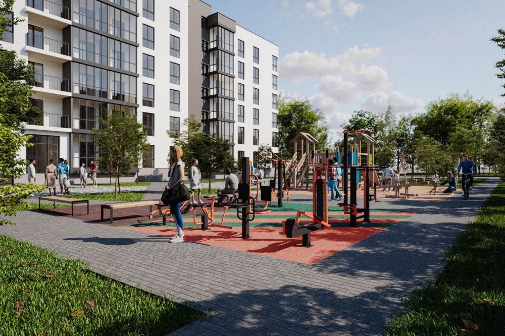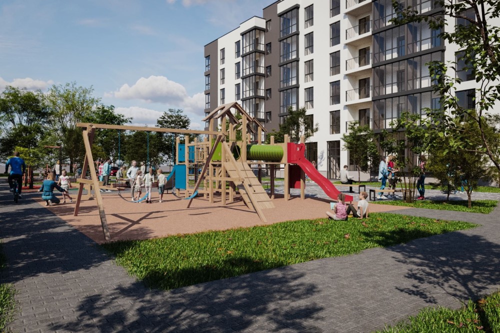 Прибудинковий простір закритий від автомобілів та повністю наданий мешканцям. Просторий паркінг, дитячий майданчик, спортивна та лаунж-зони